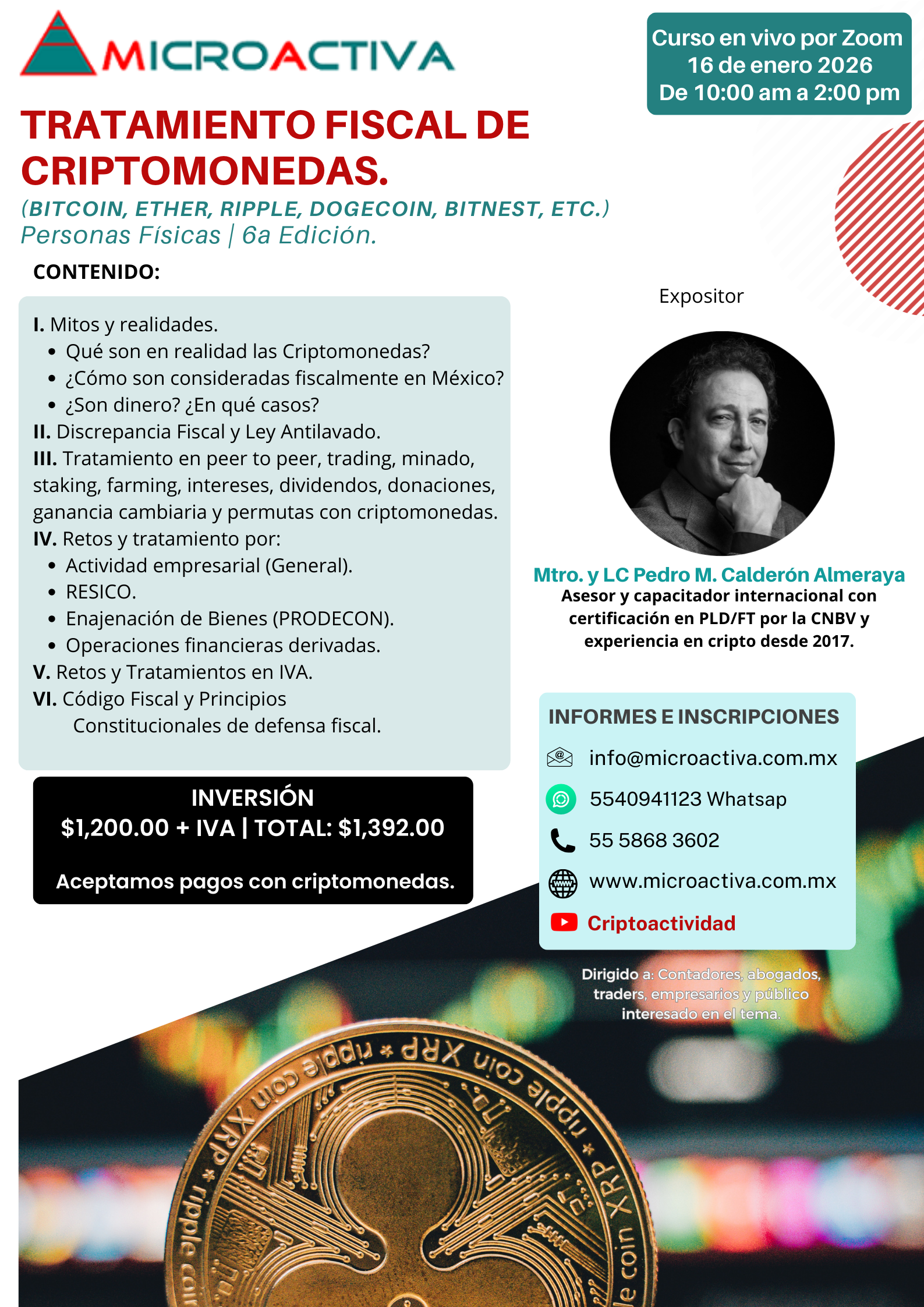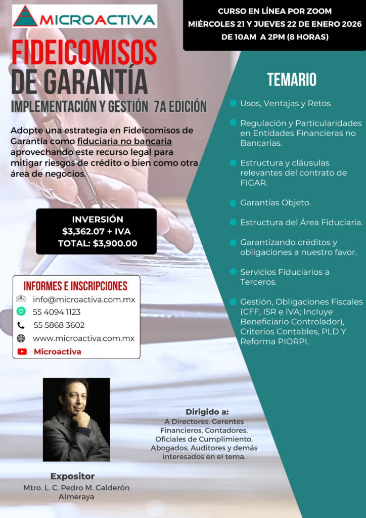 CONSTITUCIÓN Y PUESTA EN MARCHA DE SOFOMES 4 Y 5 DE FEBRERO 2026 VÍA ZOOM FINALIZADOS: FIDEICOMISOS DE GARANTIA IMPLEMENTACION Y GESTION 21 y 22 de enero 2026 VIA ZOOM TRATAMIENTO FISCAL DE CRIPTOMONEDAS16 de enero 2026 VIA ZOOM